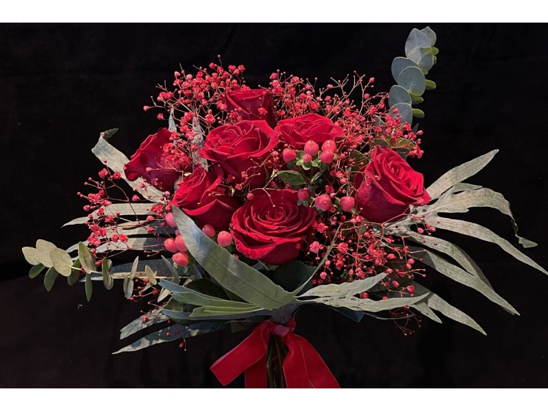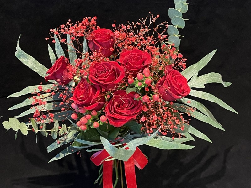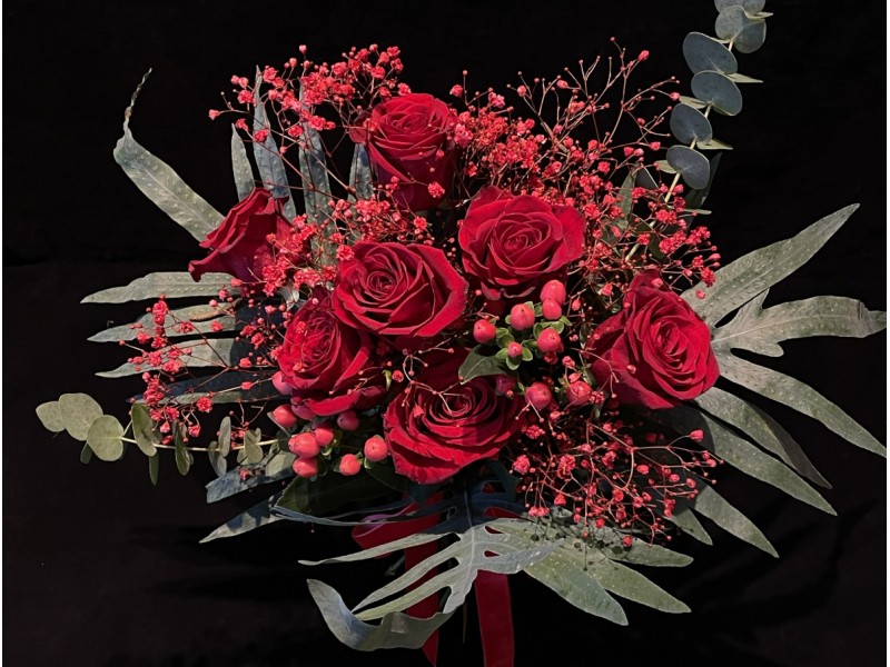 Buchet festiv de Valetine’s day cu trandafiri rosii freedom, gypsophilla rosu si phlebodium.